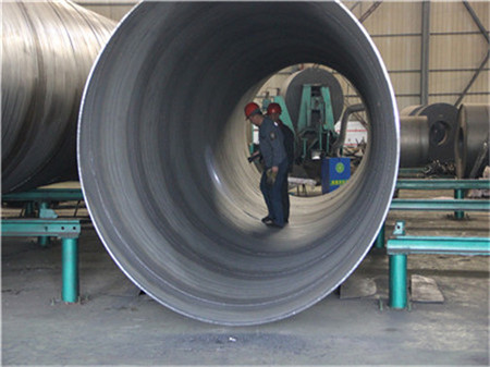 大型螺旋鋼管指的是口徑在DN850以上的螺旋鋼管。生產的主要原材料是帶鋼。螺旋鋼管的強度一般比直縫焊管高,能用較窄的坯料生產管徑較大的焊管,還可以用同樣寬度的坯料生產管徑不同的焊管。大型螺旋鋼管采用的是雙面埋弧焊技術,埋弧焊具有焊接質量穩定、焊接生產率高、無弧光及煙塵很少等優點。主要的參數外徑,壁厚,長度等。主要的力學檢測水壓、彎曲、壓扁等實驗。